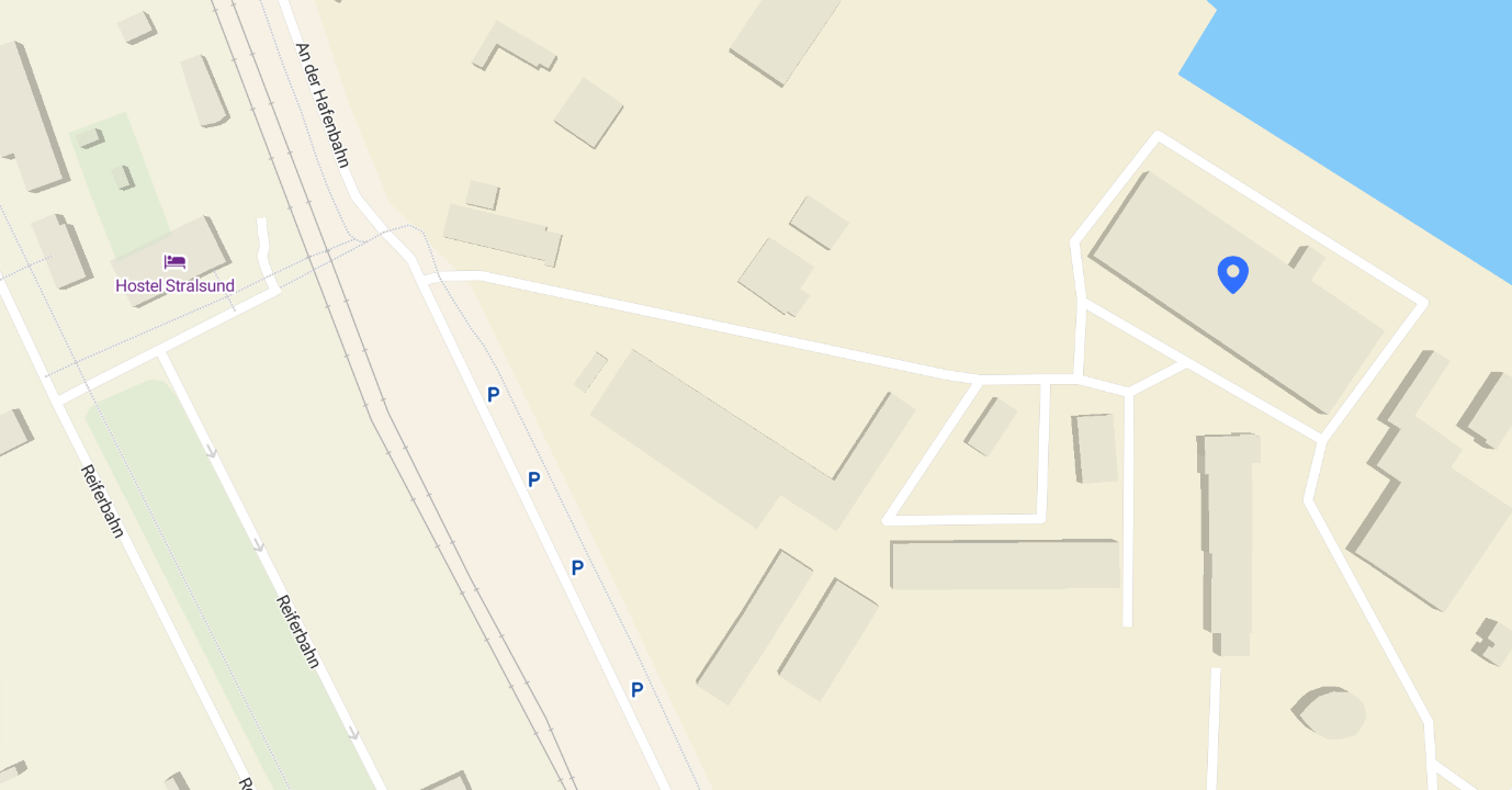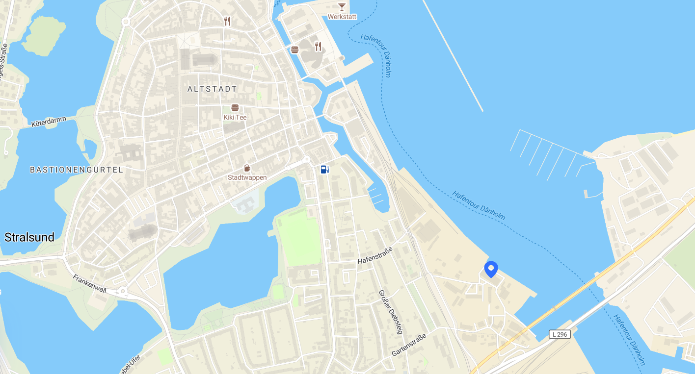 Die Bushaltestelle Hafenstraße (Linie 1 & 3) sowie der Bahnhof Stralsund Rügendamm sind wenige Minuten zu Fuß entfernt.